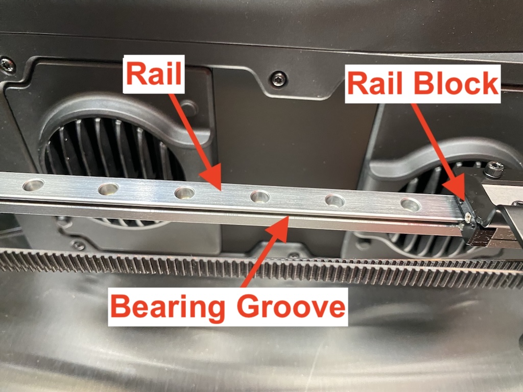 From the image below, please note that the ‘bearing groove’ is the part of the rail the rail block rides along.