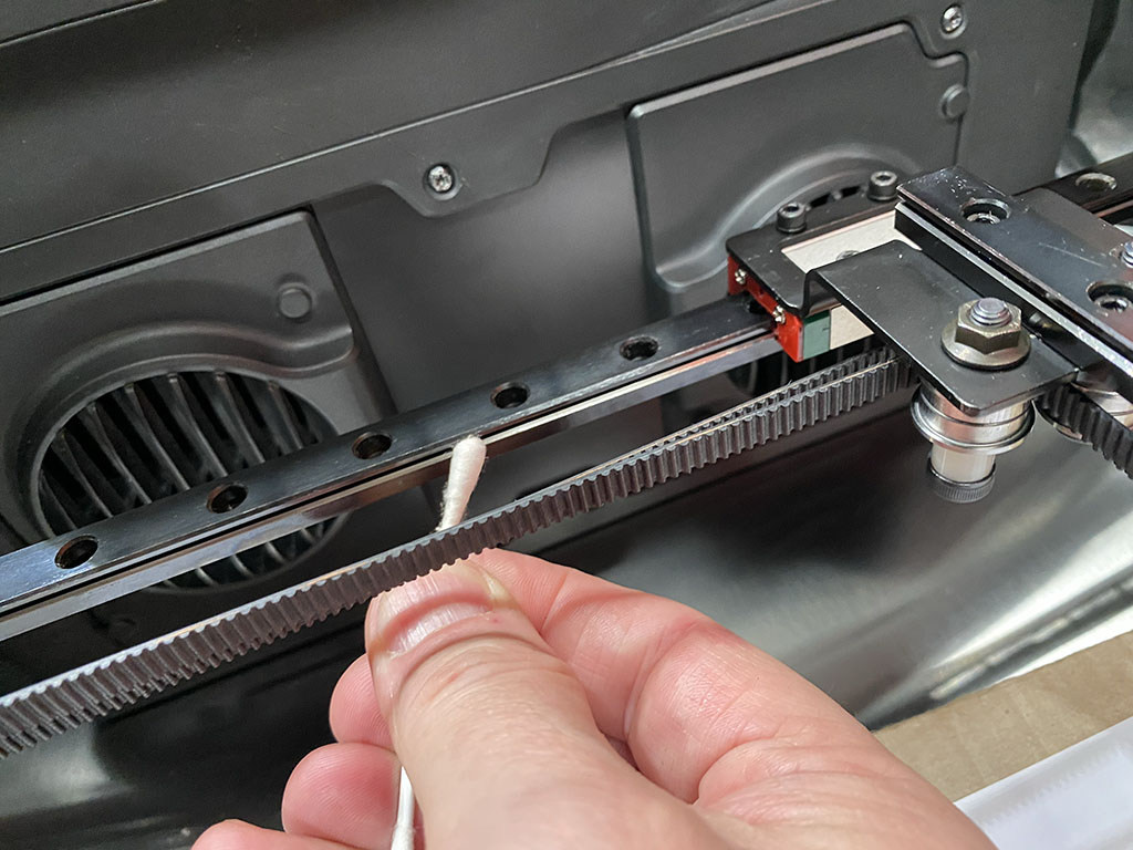Using a Q-Tip, clean the bearing grooves on all the rails. Remember that there are 2 groves on each rail, one on either side.